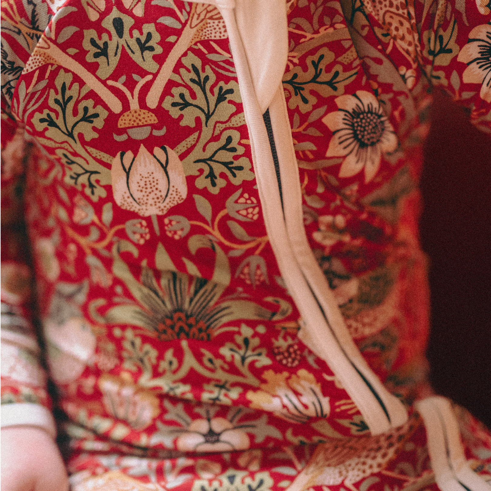 Unsere Ikone Zipster in William Morris' Druck " Strawberry Thief" von 1883, inspiriert von Drosseln, die Erdbeeren aus seinem Garten in Kelmscott Manor stehlen. Es ist eines der berühmtesten Designs der Arts & Crafts-Bewegung, reich an Details und Erzählungen.